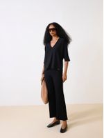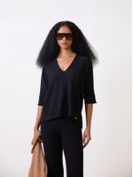 O conforto está sempre em alta, não importa a estação. Feita em Modal a blusa com decote em V é tricotada em máquinas especiais, de onde sai praticamente pronta e sem nenhuma costura. Seu shape amplo é democrático e faz um conjunto harmônico e elegante com as nossas calças de tricô.