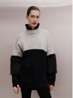 Texturas contrastantes fazem desse maxi pull um destaque da coleção. O corpo em ponto pérola e as mangas com aplicação de pele fake criam um visual invernal marcante, com toque macio e aconchegante. A modelagem ampla com aberturas laterais e gola chaminé garante conforto e movimento. Perfeito para sobrepor em looks de frio com mais informação de moda.