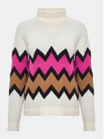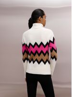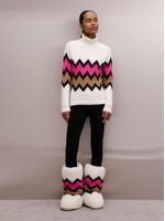 O visual vibrante e o grafismo em zigue-zague fazem deste suéter um destaque da temporada. Com gola rolê e modelagem regular, ele traz conforto e estilo na medida certa. O ponto jacquard valoriza o contraste das cores e imprime um ar retrô contemporâneo, perfeito para compor produções modernas e descomplicadas na neve.