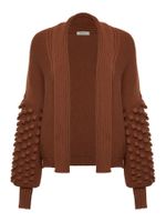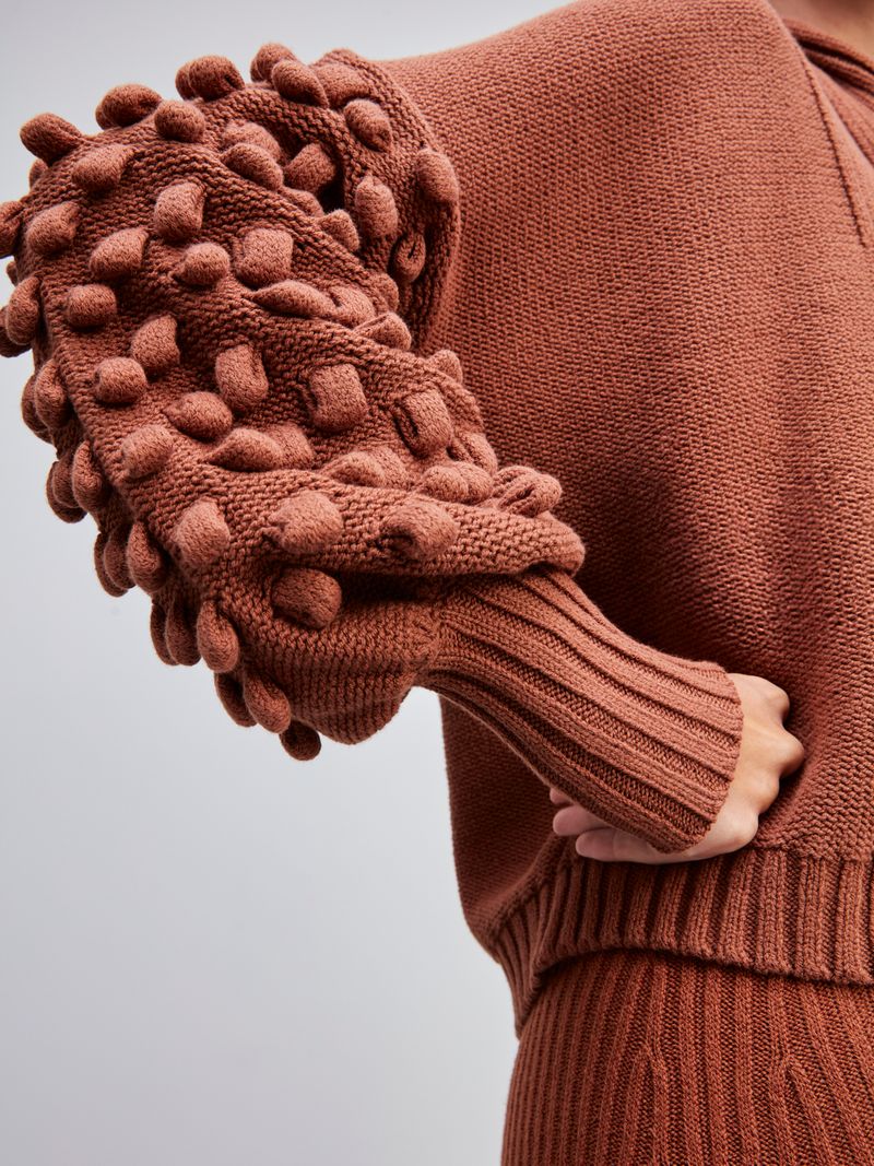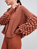 Tramas que aconchegam e convidam ao toque são destaque em Anselmi Vals. O casaqueto curto tem modelagem reta, trama canelada e mangas bufantes com gotas em relevo. Um detalhe que eleva o look, trazendo volume e textura para a terceira peça.