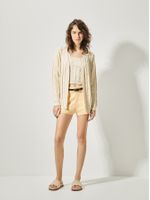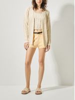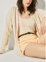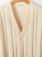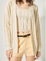 A delicada trama em ponto aran e tranças traz um toque vintage para o casaco em tricô. A terceira peça aconchegante possui mangas longas e é perfeita para arrematar os looks do dia a dia com muito estilo e conforto.
