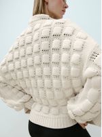 O casaco que transforma o tricô em arte. O ponto ravioli cria um efeito tridimensional surpreendente, adicionando volume e textura à peça. A modelagem reta equilibra as proporções, garantindo sofisticação com um toque moderno.