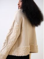 A jaqueta statement se destaca pelo mix de tramas cheio de texturas. Com modelagem reta e abertura frontal, a peça celebra a riqueza do handmade e transforma qualquer look em uma superprodução.