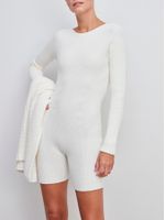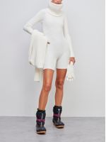 O macaquinho canelado tem modelagem ajustada, decote canoa e comprimento curto. Ideal para criar sobreposições com casacos quentes, a peça traz um toque moderno e fashionista para os looks aprés-ski.