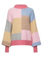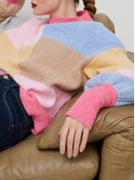 Quando o tricô é o protagonista, um jeans básico completa o look. O suéter amplo combina blocos de cor e o charme das mangas bufantes para criar um visual moderno e feminino. Aposte neste irresistível mix de candy colors para renovar seus looks de frio.