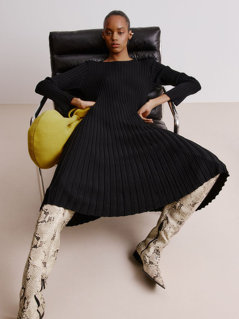 O Vestido Anselmi + Consuelo Blocker Coloca a Beleza do Tricô em Movimento Graças Ao Efeito Plissado da Trama e o Shape Evasê da Saia. o Comprimento Midi Arremata o Visual Elegante da Peça, Que Tem o Visual Perfeito para Compor Os Looks Mais Elegantes da Temporada.
