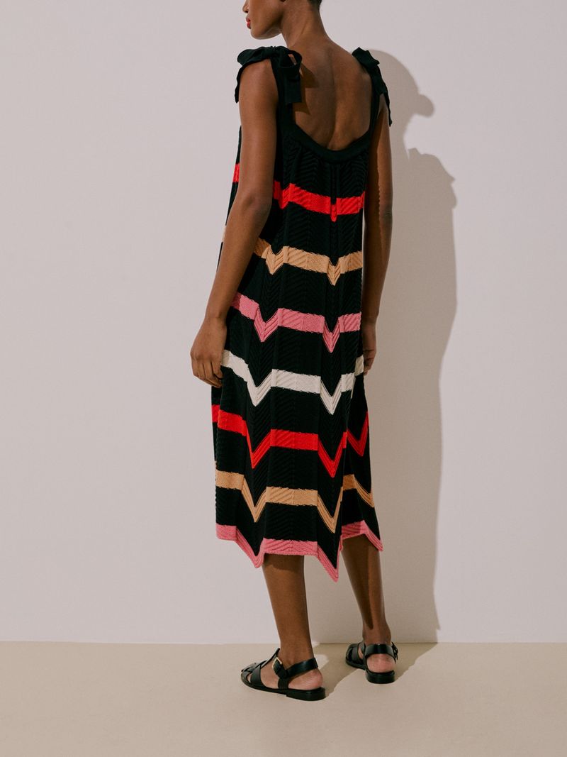 O estilo autêntico e colorido de Ucha Meirelles é a inspiração do vestido listrado. A combinação de cores e os laços nas alças trazem alegria e frescor à peça, que é perfeita para um dia de verão.