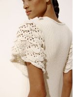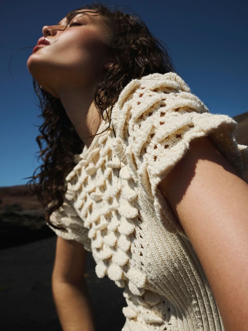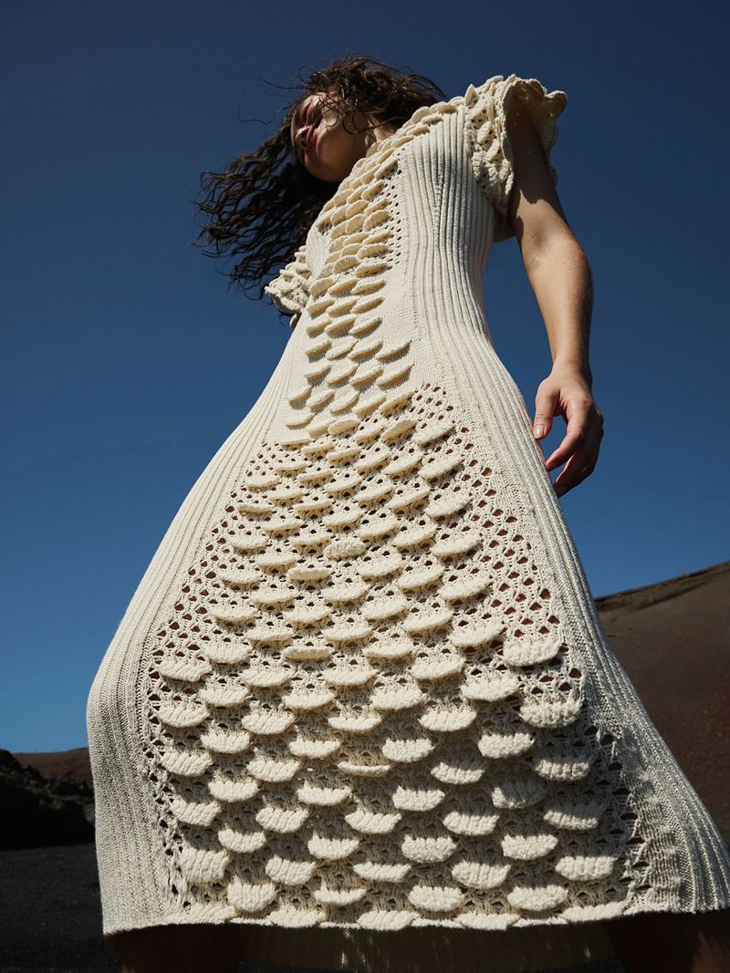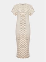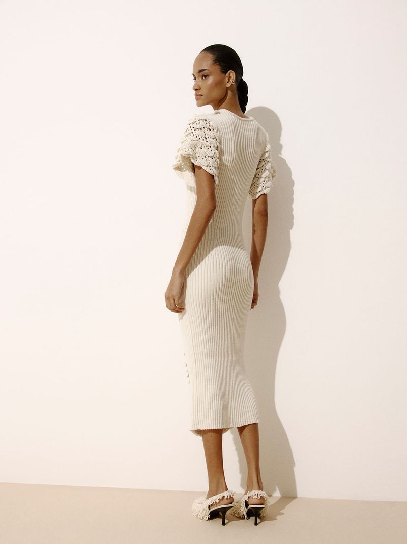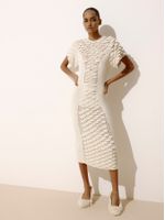 O vestido midi em ponto concha traz relevos inspirados nas formas marinhas, que convidam ao toque e adicionam textura à trama. Com modelagem ajustada, decote redondo e mangas curtas, a peça única cria um visual elegante e original para os dias de verão.
