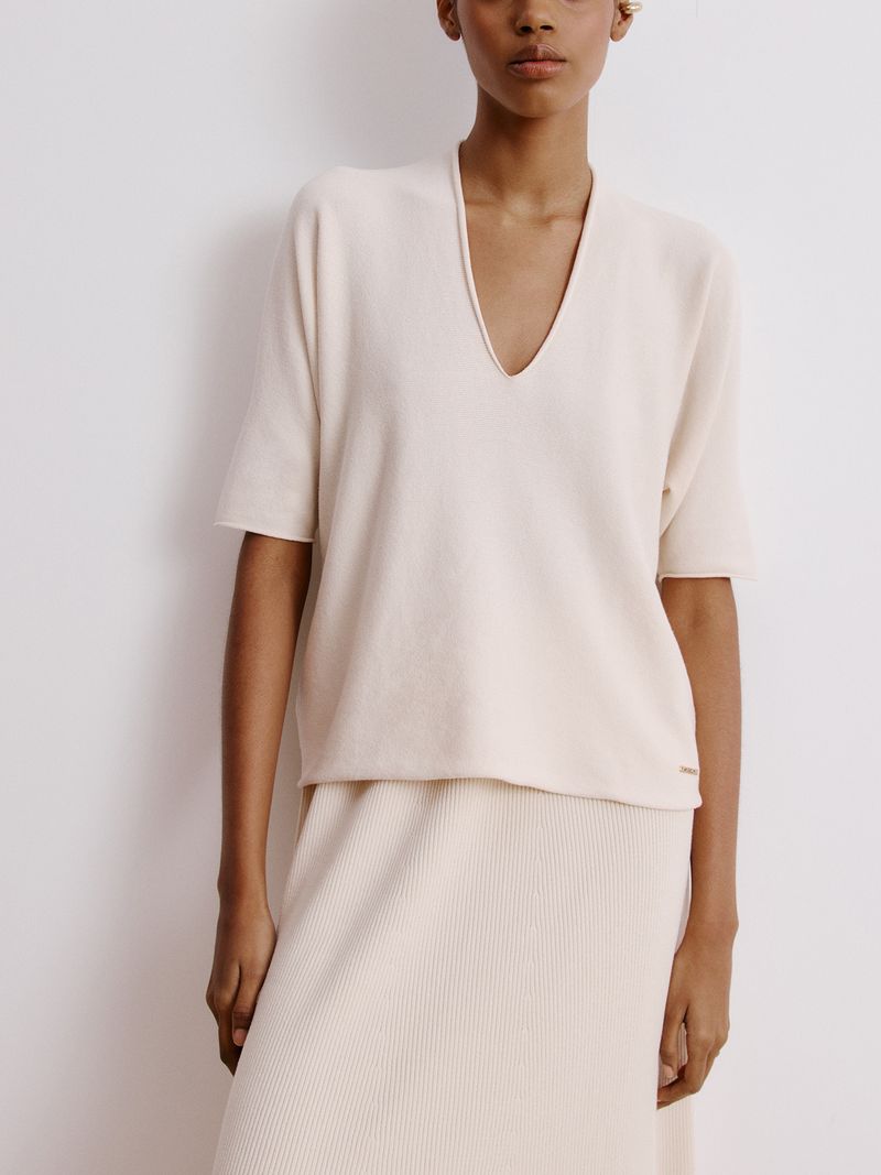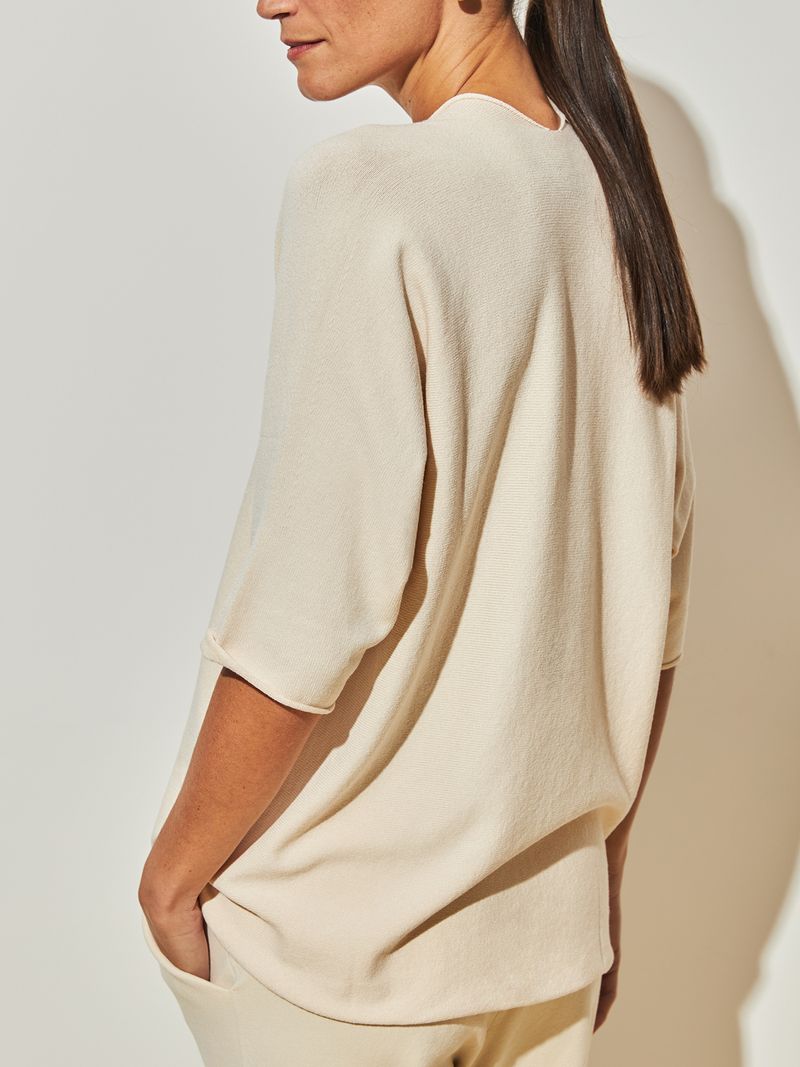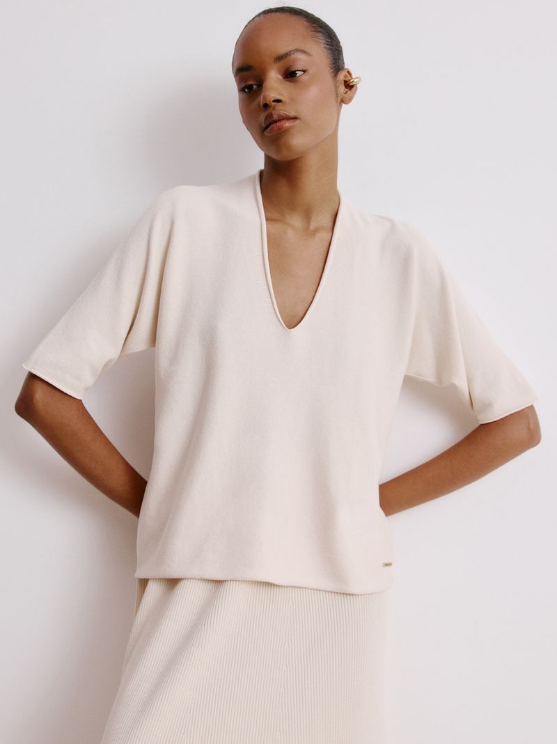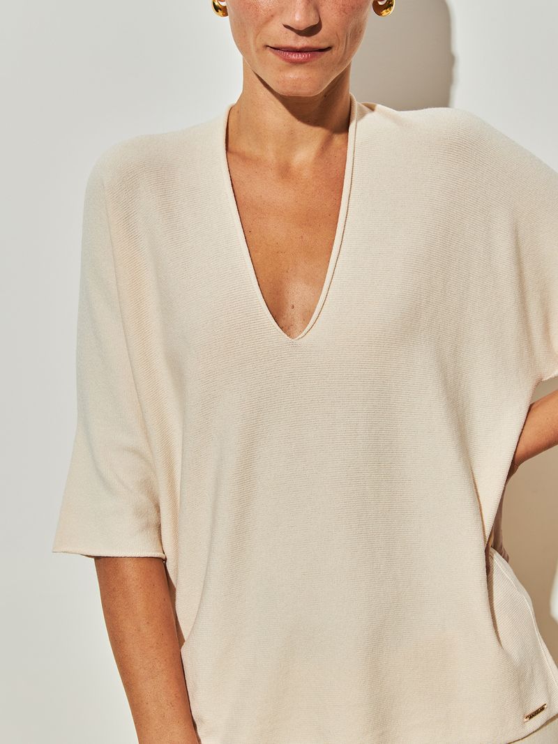 Comfort is always at a premium, no matter the season. Made in Modal, the V-neck blouse is knitted on special machines, leaving it practically ready and without any seams. Its wide shape is democratic and makes a harmonious and elegant set with our knitted pants.