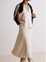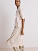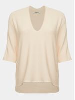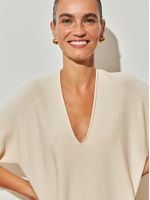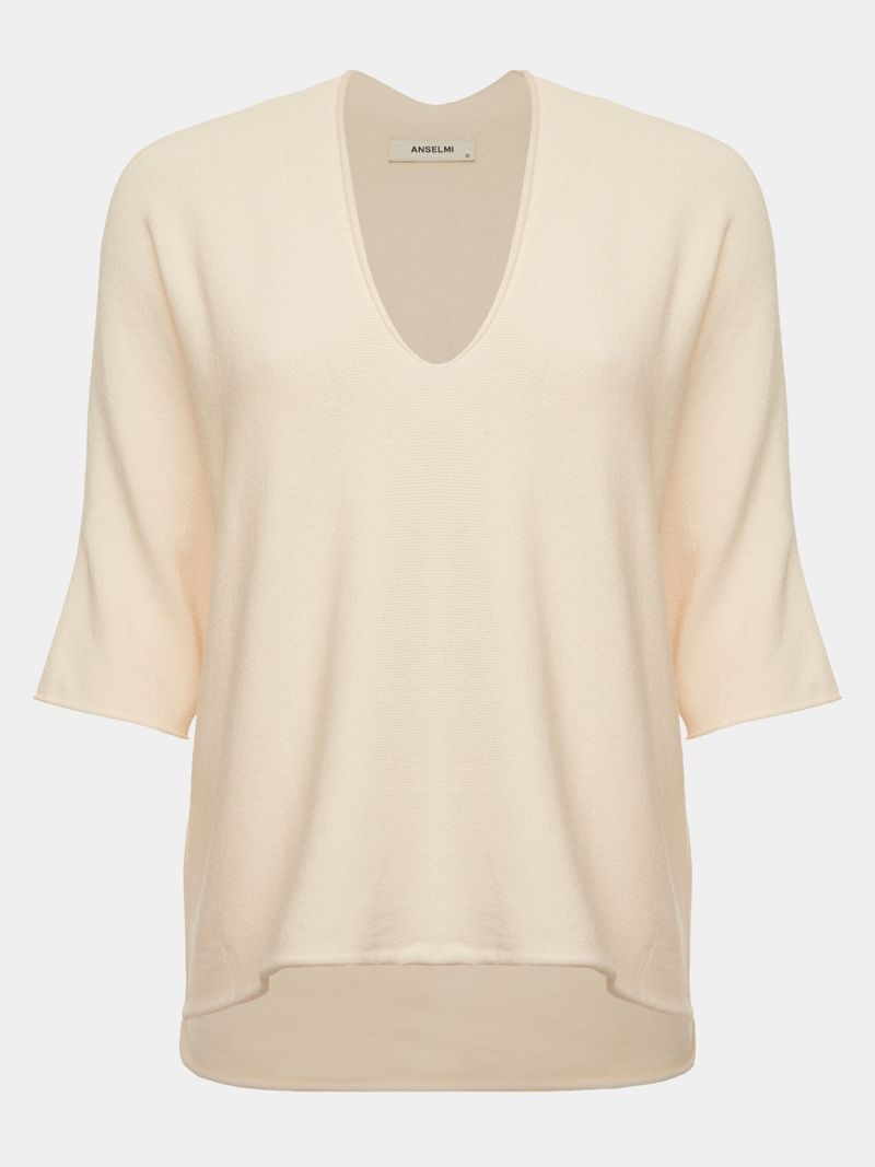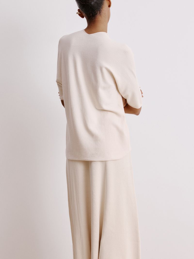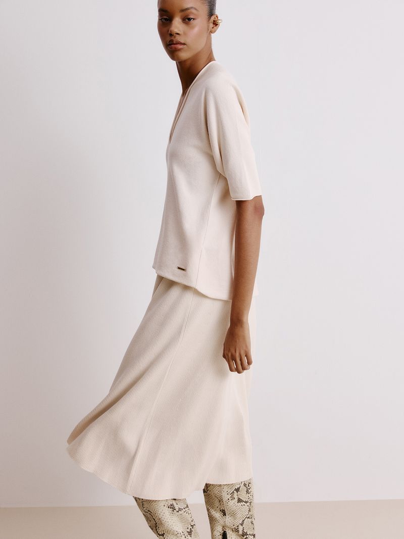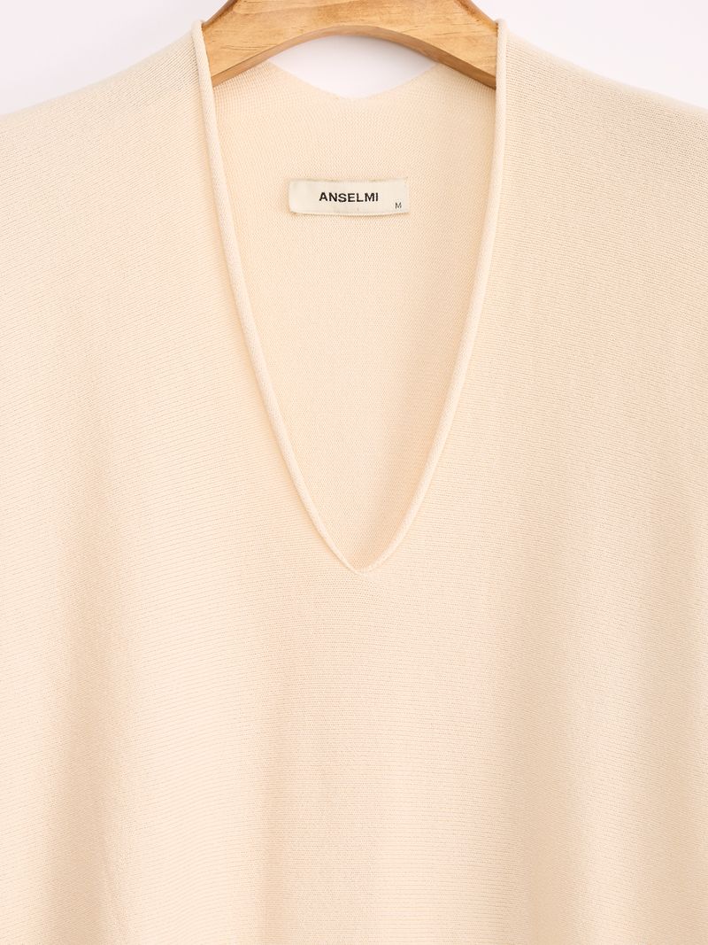 Comfort is always at a premium, no matter the season. Made in Modal, the V-neck blouse is knitted on special machines, leaving it practically ready and without any seams. Its wide shape is democratic and makes a harmonious and elegant set with our knitted pants.