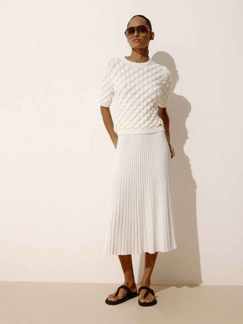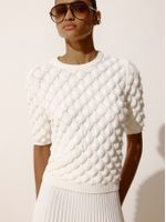 Basics can be extraordinary. The short-sleeved blouse has a scalloped weave that adds volume and texture to everyday looks. Pair it with denim shorts for a vintage look or mix it with a solid knit for a stylish monochrome look.