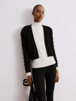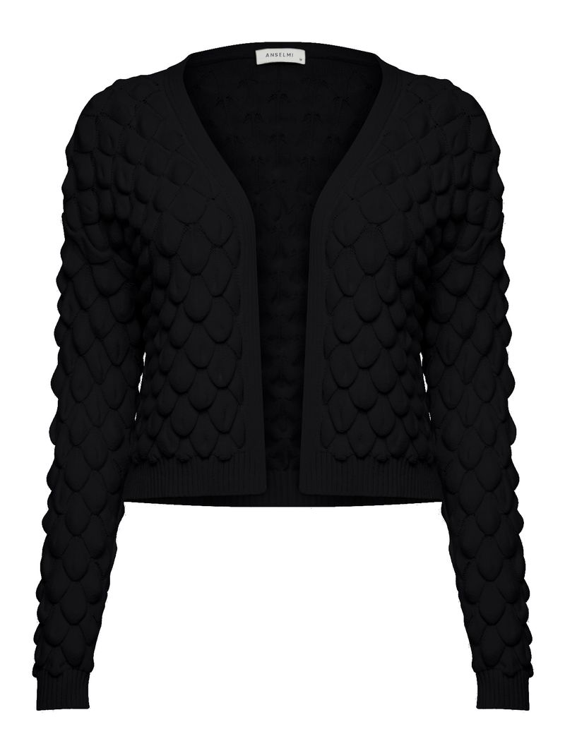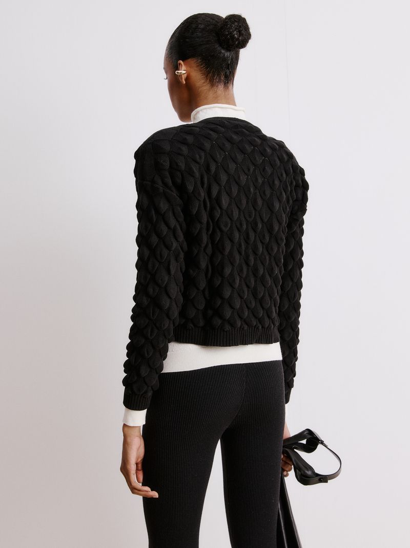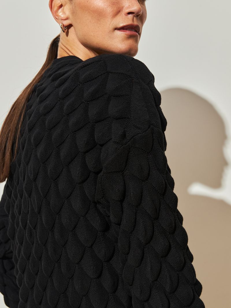From third piece to protagonist of the look. The long-sleeved jacket has a fitted design and a scale weave weave, which brings volume and texture to everyday looks. Combine with plain knits to balance the look of the piece.