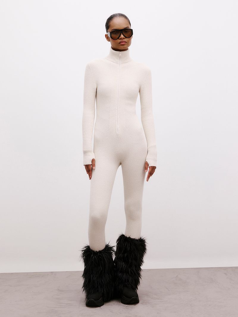 Inspired by the sporty and dynamic mountain style, the ribbed jumpsuit is a versatile and elegant piece. With a chimney collar and a zipper opening on the front, knitwear is ideal to accompany your moments off the track.