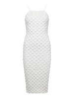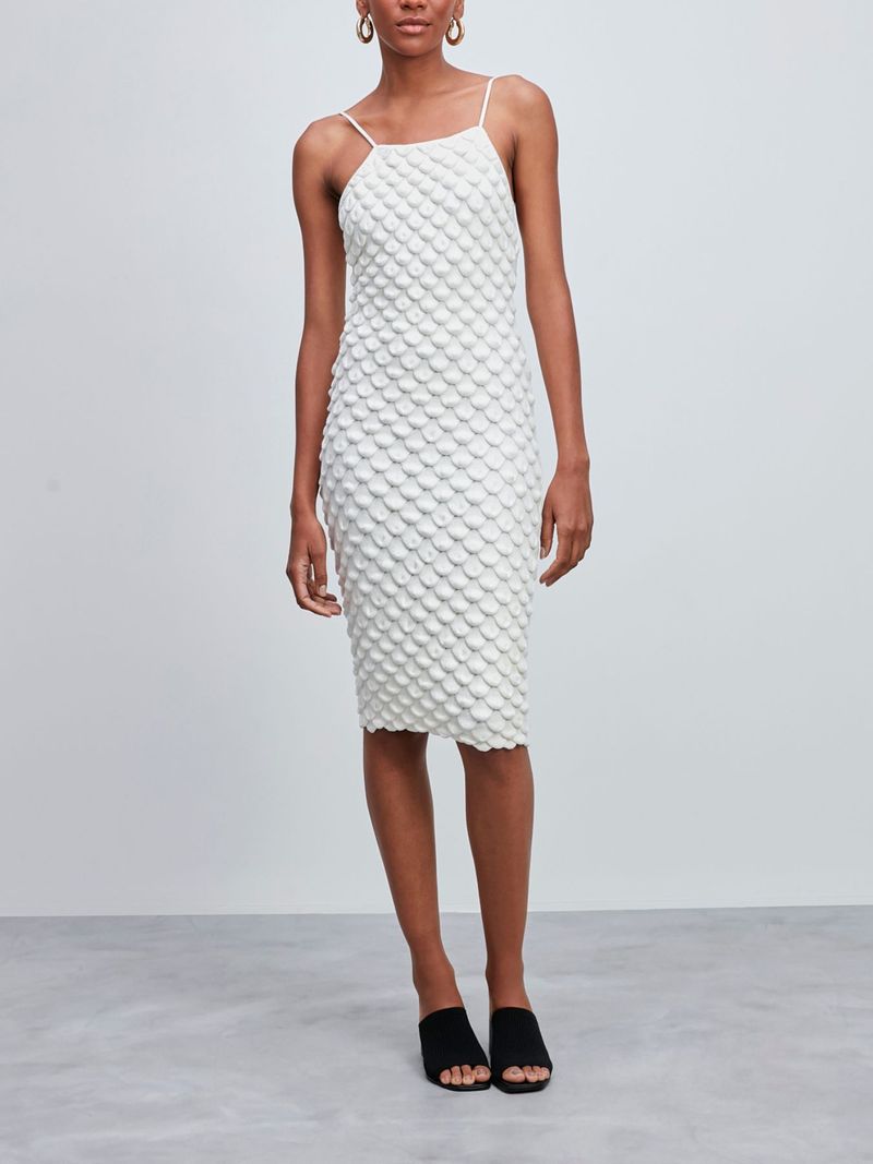 Sexy and elegant in size, the midi dress has a fitted fit, delicate straps and a powerful neckline at the back. The scale-stitch weave, inspired by Brazilian craftsmanship, adds a luxurious texture to the look and has a touch of elastane that guarantees a perfect fit