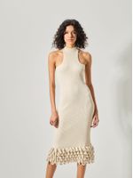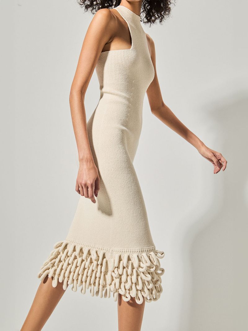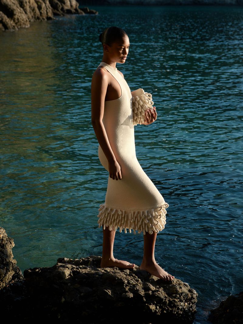 The midi dress has a fitted design, a racerback neckline with a high collar and a minimalist ribbed weave. The twist is the voluminous fringe, which refers to the nautical landscape of the Mediterranean and creates a stunning look. Elegance and originality in a single piece.